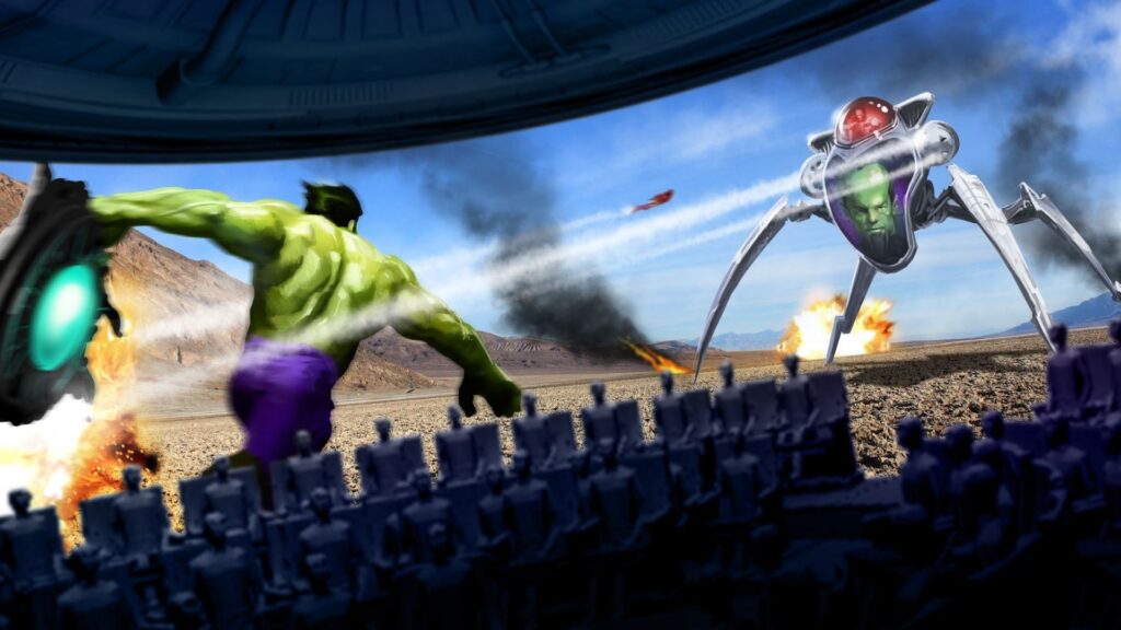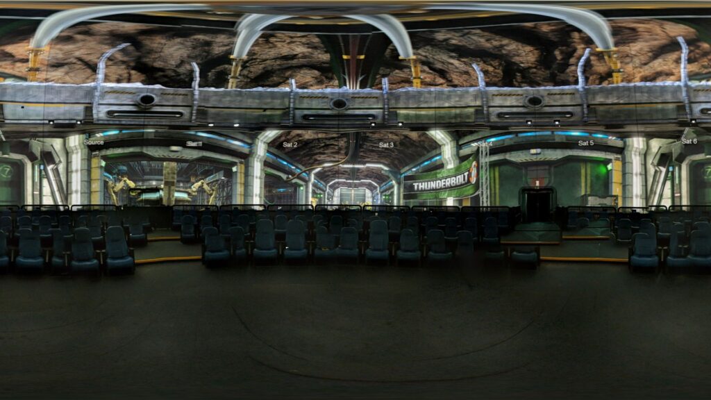 While construction was occurring, Falcon’s Creative Group’s media development team was hard at work finalizing the story of Hulk: Epsilon Base 3D. After that was done, it was time to start 3D modeling characters and environments, animating those rigged characters, and rendering the final frames. Because CircuMotion® Theater lives inside of a dome, the virtual camera in the media renders the world like a panoramic, so guests can see all around them. It was therefore imperative that the story allowed for something interesting to be happening in all directions. For example, while Hulk is smashing through walls on one side, Iron Man is shooting mechs on the opposite side. This means guests will have a different experience every time they ride, depending on where they sit. As the media was being rendered, camera data was converted into machine code so CircuMotion® Theater’s movements could more closely match the media.